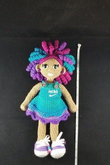 She can be created in any of my 12 skin tones (see last picture in listing for actual color) and stands approx. 12" from toe to curls. She is rocking her natural curls. Her outfit compose of a shirt button in the back, overall style dress, and sneaker shoes; everything is completely removeable.